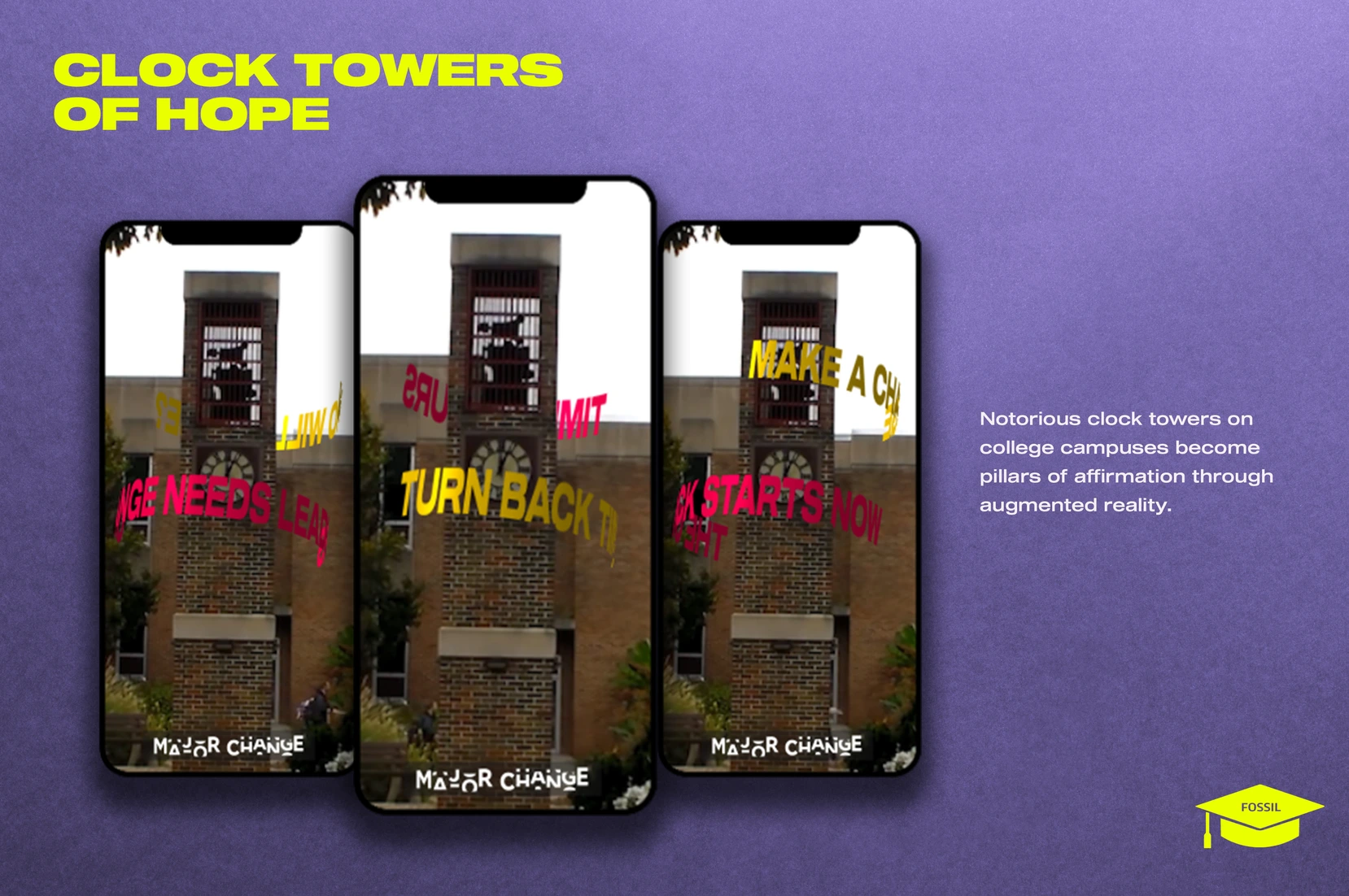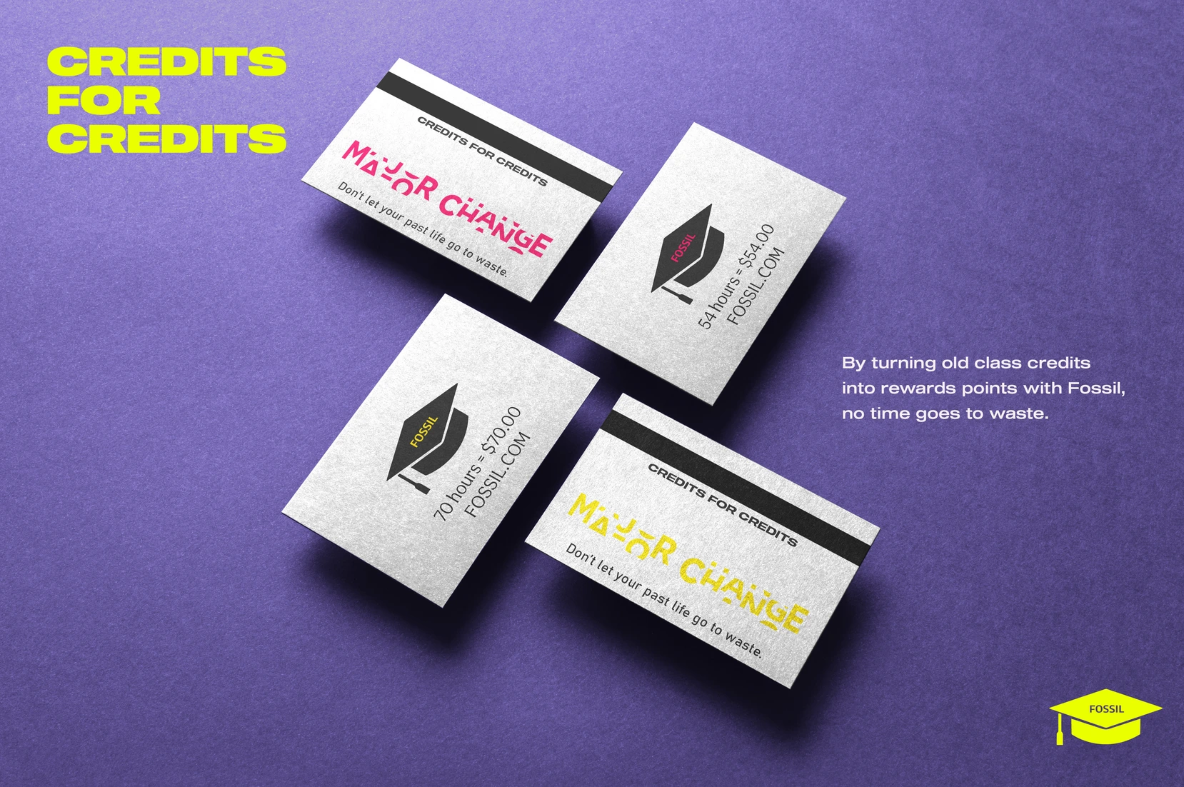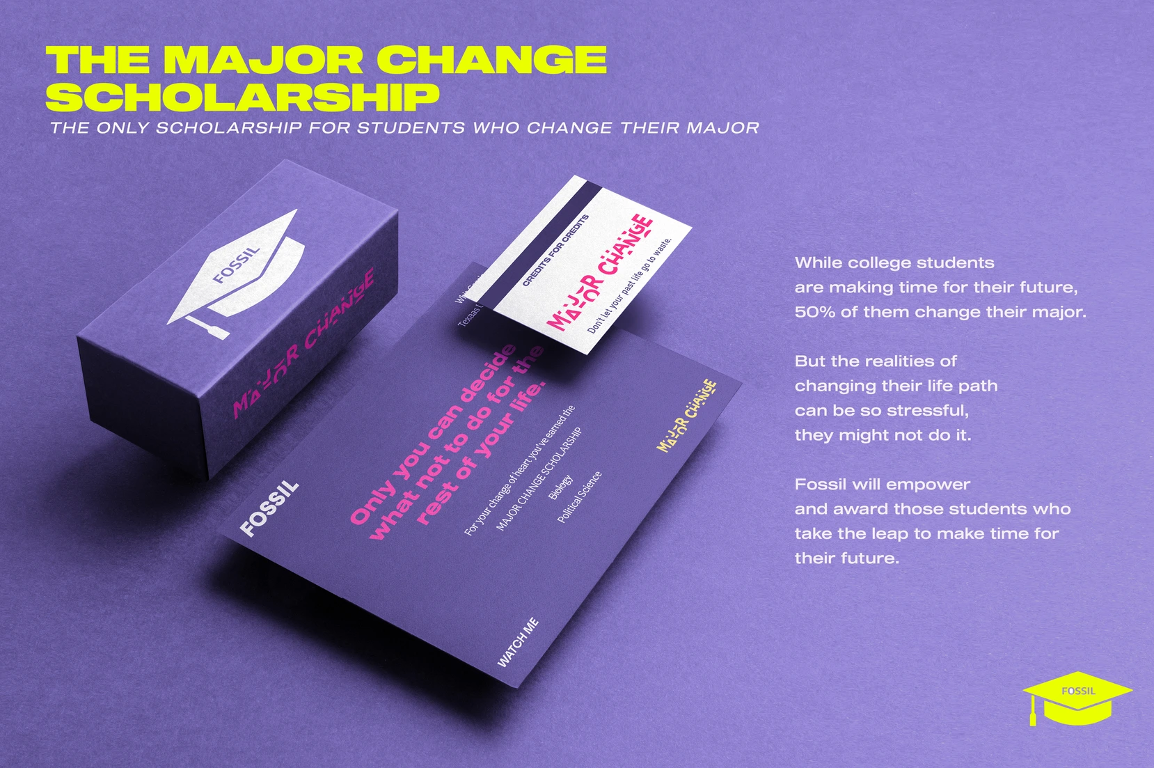 While college students are making time for their future, 50% of them change their major. Fossil will empower and award those students who take the leap to make time for their future. (D&AD Pencil winner)